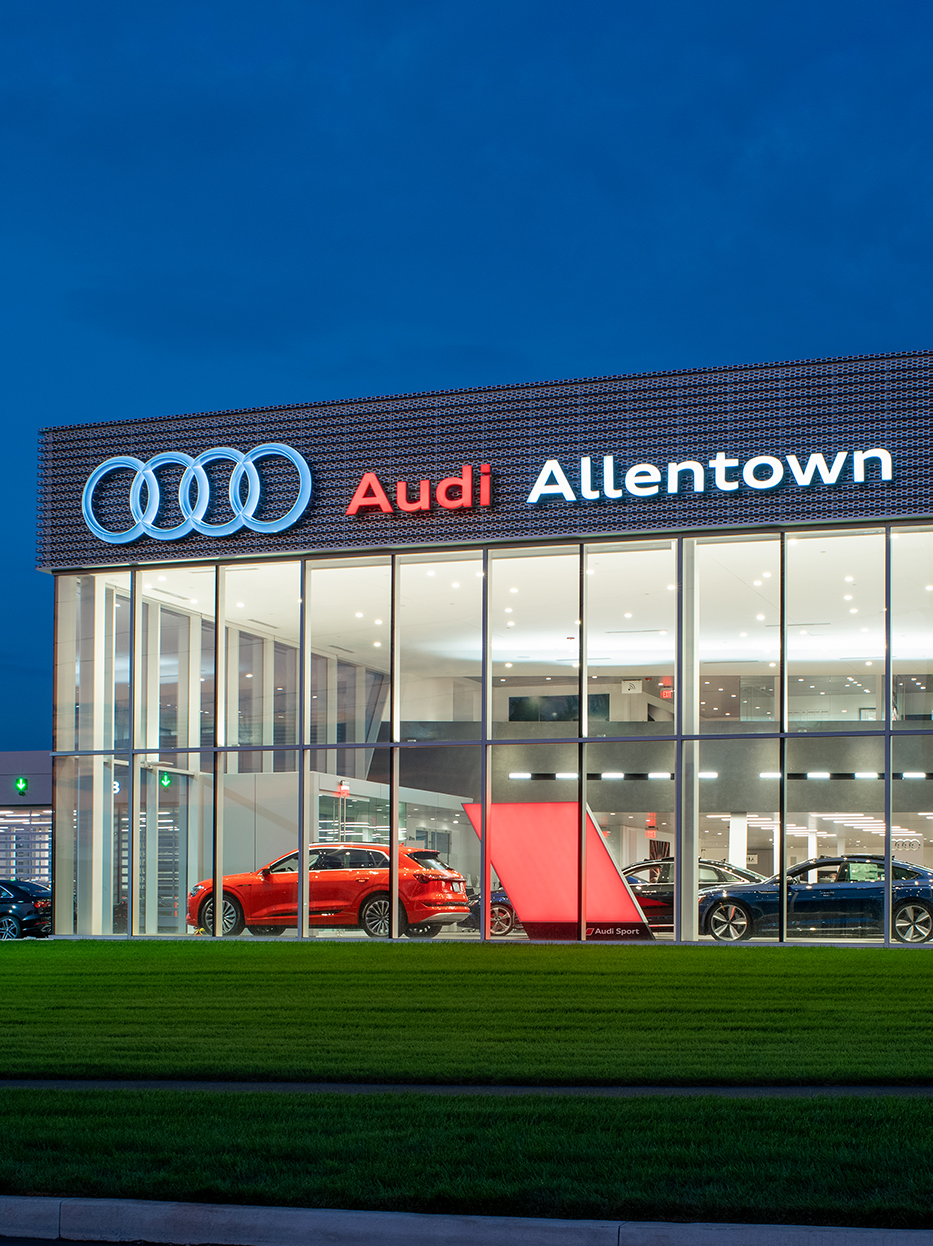 The Ciocca team has worked with Boyle Construction to build and renovate multiple dealerships. Some of the latest construction includes a new Lehigh Valley Audi dealership, renovated Subaru and Ford dealerships, all to brand standards. The Subaru and Ford renovation were multi-phased renovation and additions that allowed staff to remain operational throughout careful planning of the construction schedule. The new 38,000 SF Audi facility features a showroom, offices and service stations. This dealership was built on a Brownfield that required extensive drainage control and site work enhancements including geopiers. The completed showroom is a showpiece example of the premier Audi brand.