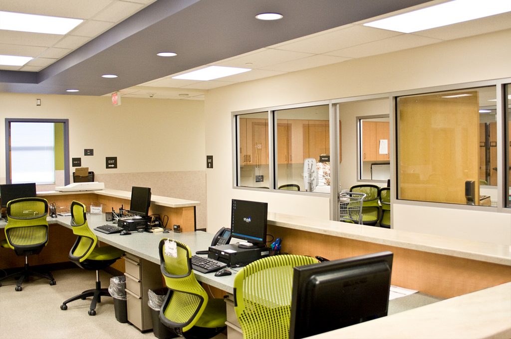 The SLUHN KidsCare Clinic is located on the second floor of the Northampton Community College’s Fowler Family Southside Center. The 6,300 SF Clinic includes a welcoming waiting area as well as 16 exam rooms and support areas. The space was designed with a raceway circulation pattern, with exam rooms along the perimeter and support areas focused in the center. A visual connection between the reception area and the nurse’s station allows for interaction by all staff members. Vibrant colors were integrated to make the children’s experience friendly and inviting. The entire project is within the Bethlehem Steel Brownfield property and allowed for re-purposing an abandoned office building from the defunct steel company.